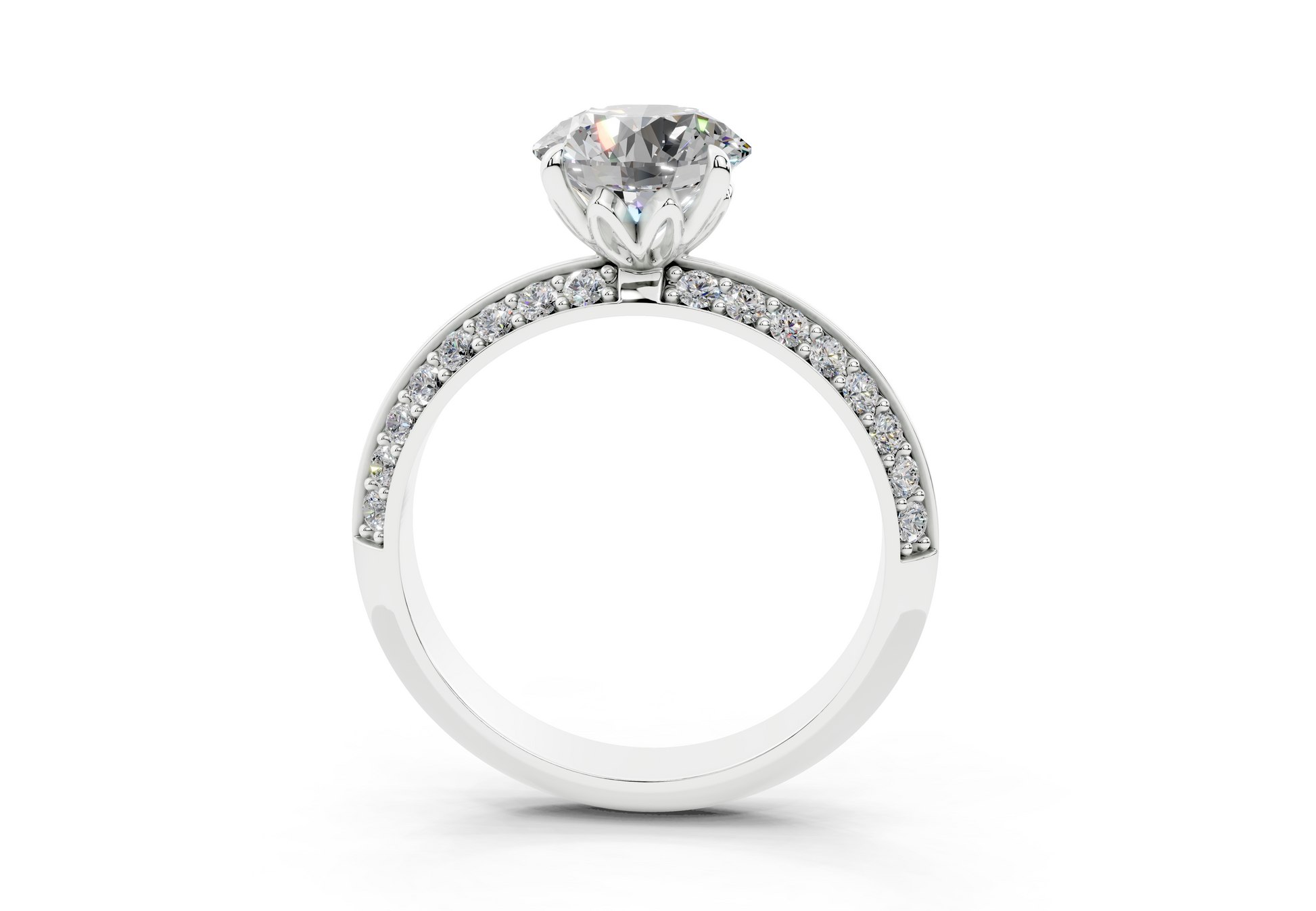 This 18K gold Engagement Ring features a dazzling 1-carat diamond cradled in a feminine six-prong lotus flower basket, blending vintage charm with contemporary style. Half pavé detailing along the knife-edge band adds sparkle and sophistication, ensuring every angle catches the light beautifully. Crafted with impeccable precision, this ring is designed for lasting beauty and comfort, making it a perfect symbol of your enduring commitment and shared dreams.
