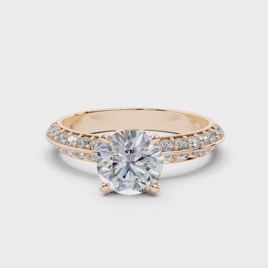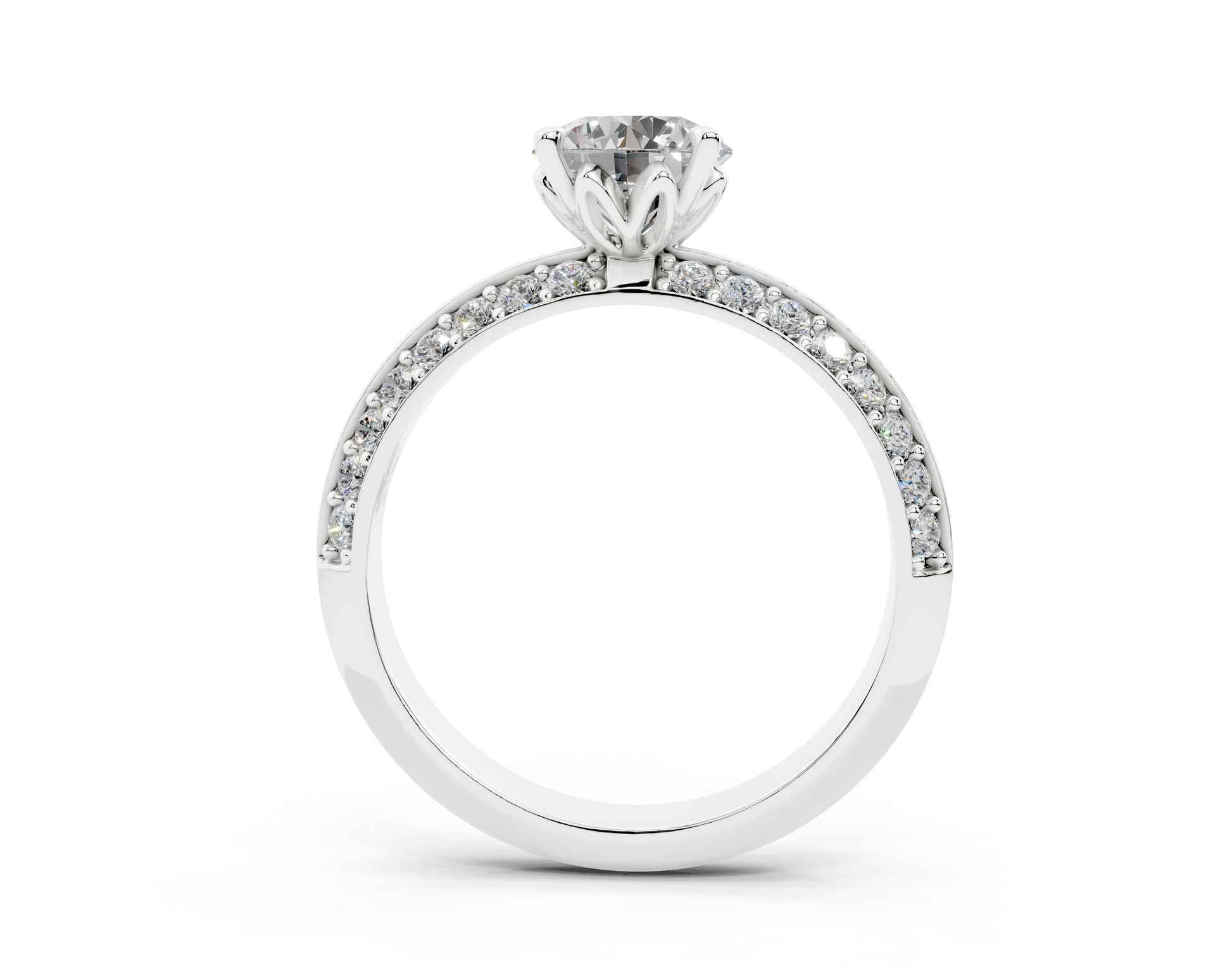 This 18K gold Engagement Ring features a dazzling 1-carat diamond cradled in a feminine six-prong lotus flower basket, blending vintage charm with contemporary style. Half pavé detailing along the knife-edge band adds sparkle and sophistication, ensuring every angle catches the light beautifully. Crafted with impeccable precision, this ring is designed for lasting beauty and comfort, making it a perfect symbol of your enduring commitment and shared dreams.
