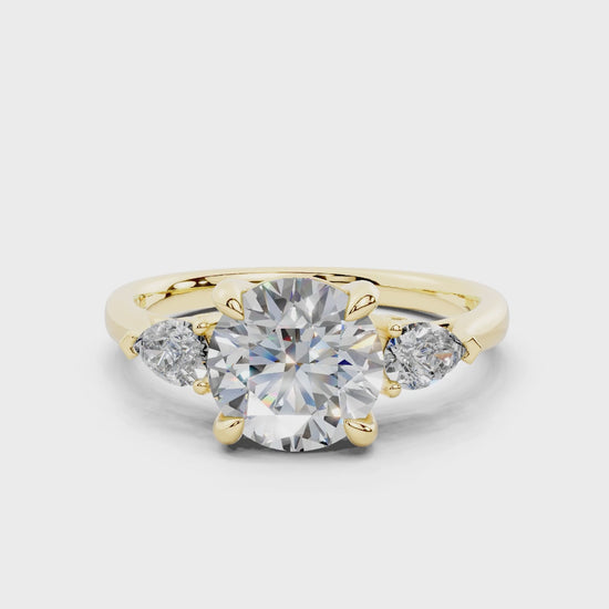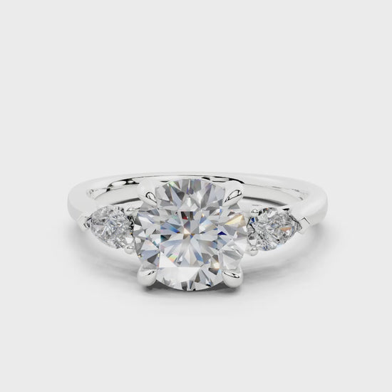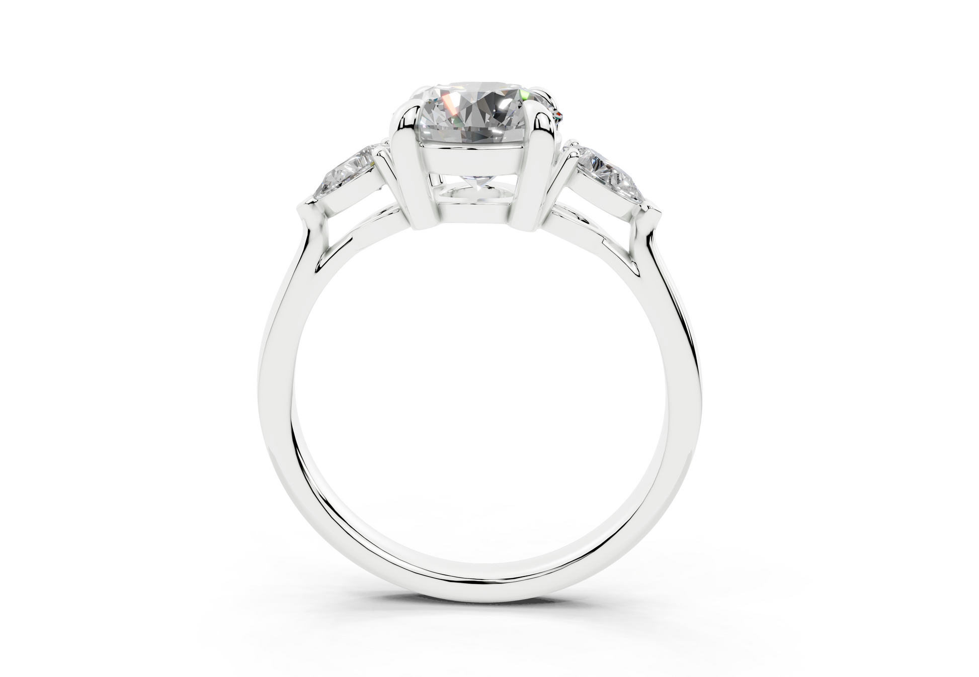 The Diamond Engagement Ring features a stunning arrangement of two smaller pear-shaped diamonds flanking a dazzling center stone. This design enhances the brilliance of the 1-carat diamond, creating a captivating sparkle from every angle. With its thoughtful placement, this ring highlights the center stone's beauty while offering a unique, eye-catching style. A perfect symbol of your love’s journey, this ring is crafted to make a lasting impression.