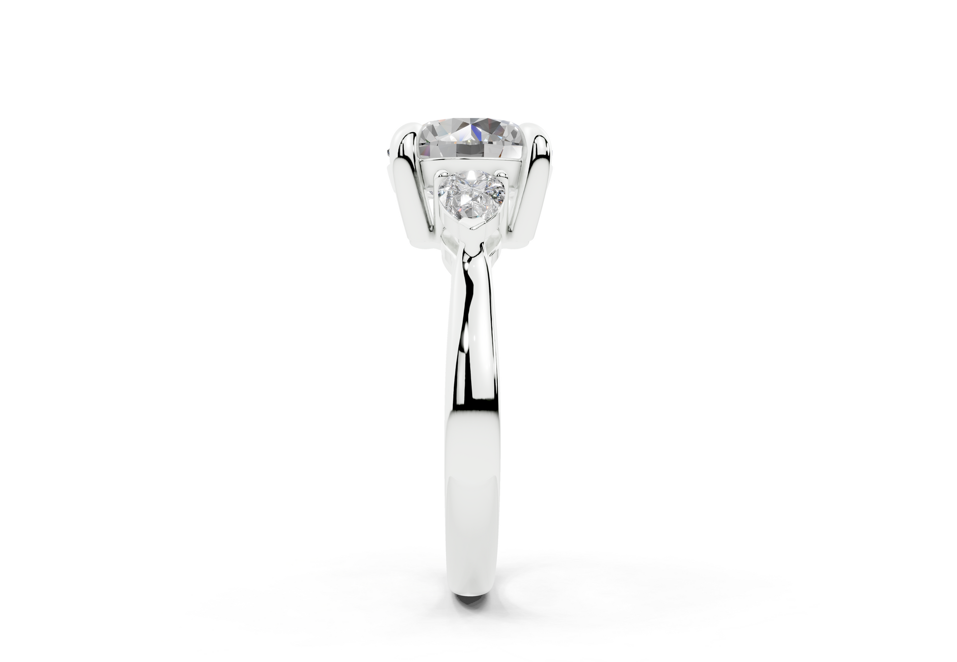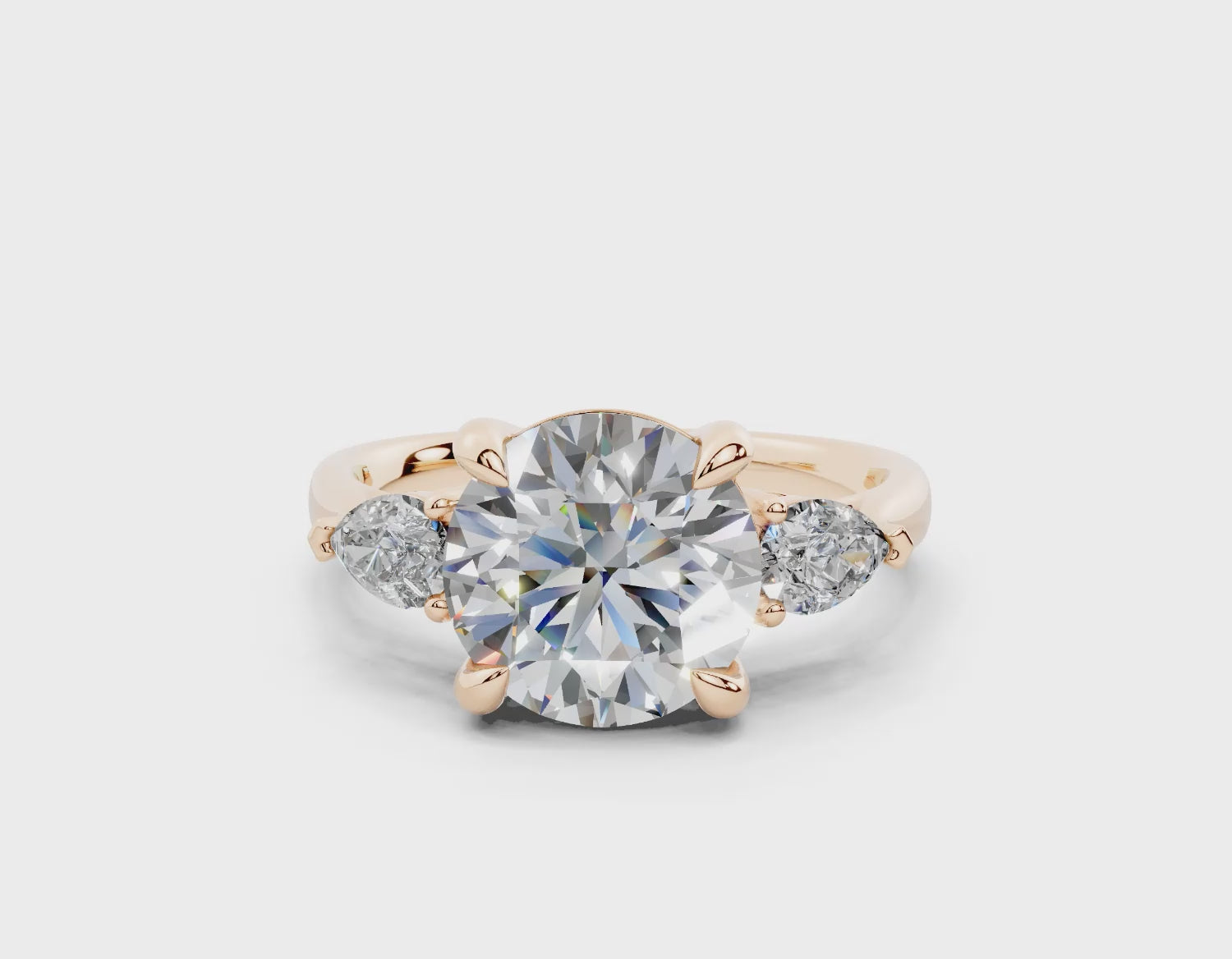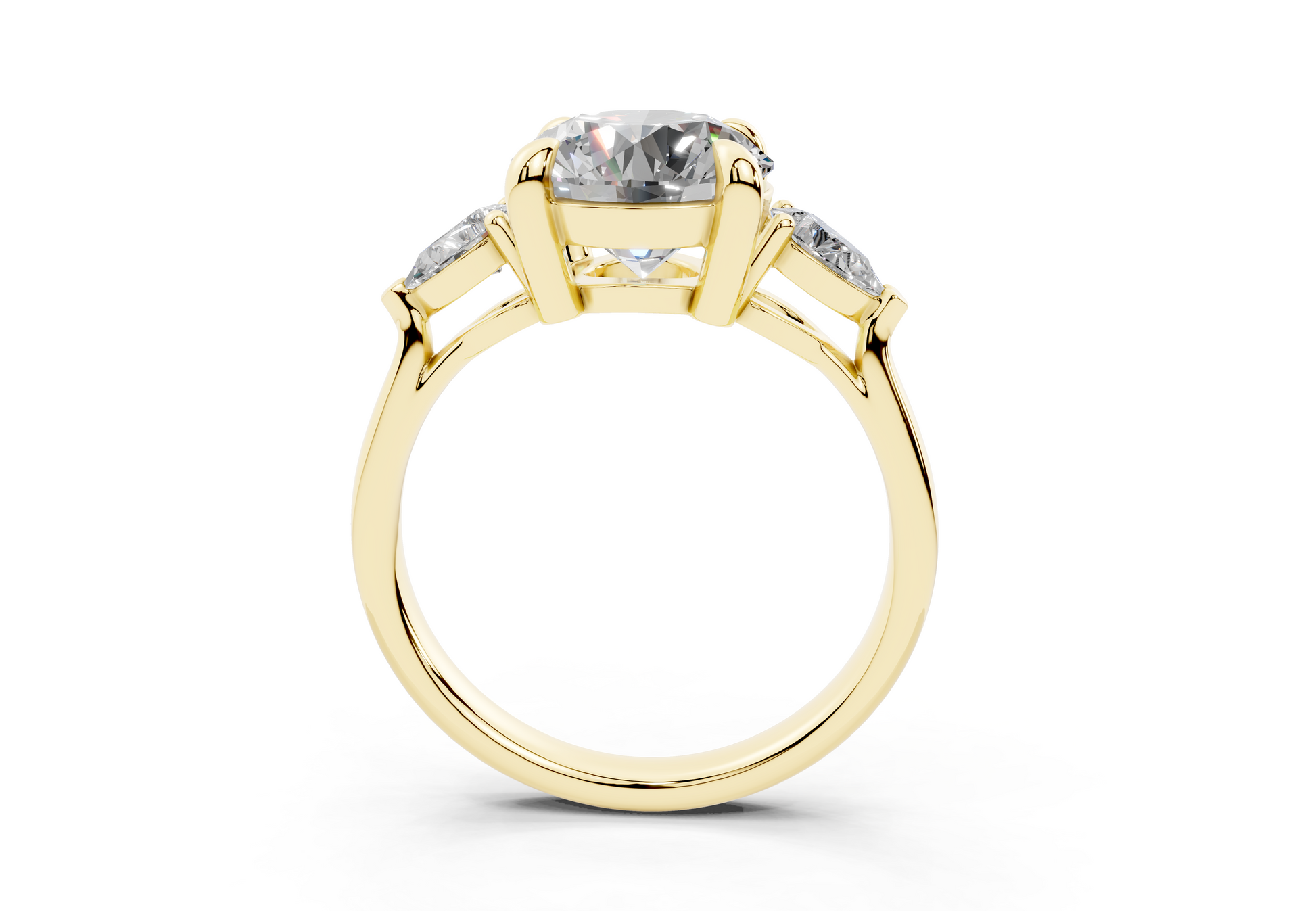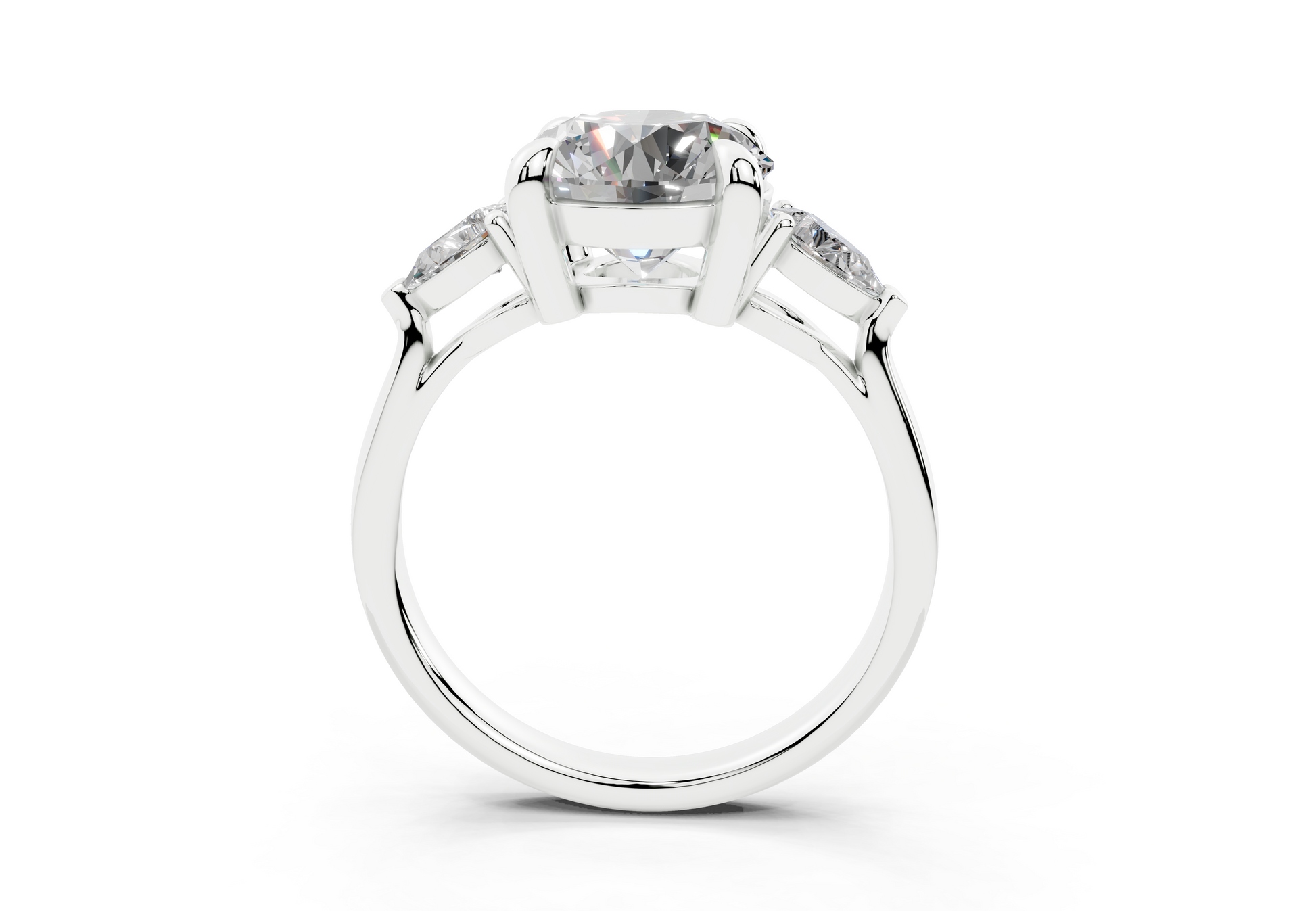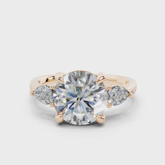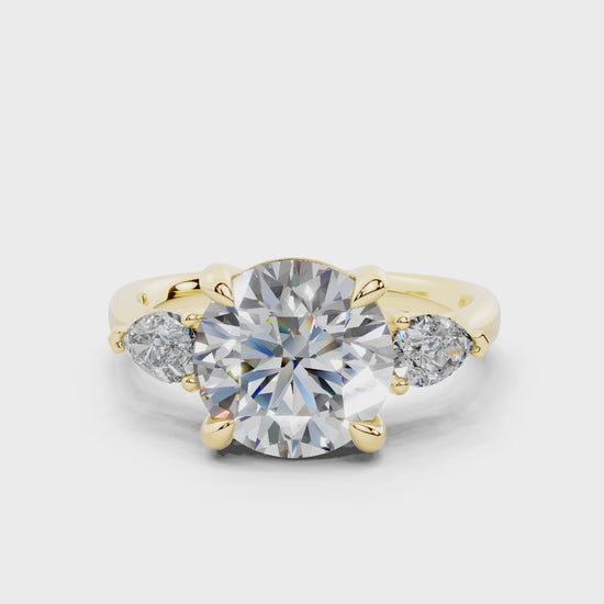 The Diamond Engagement Ring features a stunning arrangement of two smaller pear-shaped diamonds flanking a dazzling center stone. This design enhances the brilliance of the 1-carat diamond, creating a captivating sparkle from every angle. With its thoughtful placement, this ring highlights the center stone's beauty while offering a unique, eye-catching style. A perfect symbol of your love’s journey, this ring is crafted to make a lasting impression.